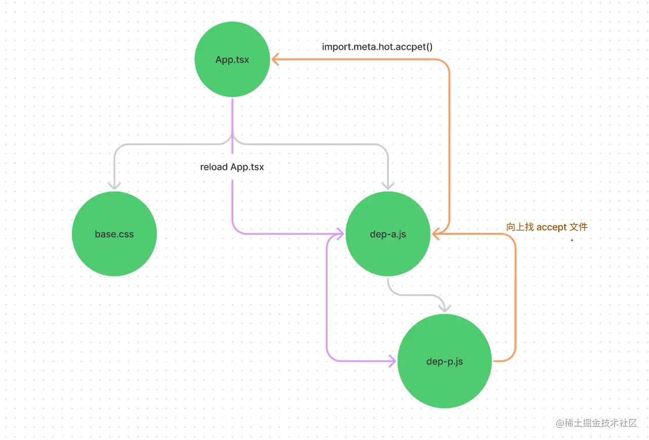 这部分实现参考了 Snowpack 和 Vite , 文件更新时,通过内部建立好的依赖关系,上溯至 accept 该文件或自身的文件节点,重新在浏览器请求该文件, 如下图: