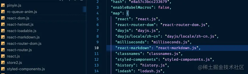 可以看到依赖项 object-assign 会额外带有版本号信息。在递归下载第三方依赖 ESM 文件后,能够得到如下的 json 文件,存储某个版本依赖实际 ESM 文件的路径, 如下:
