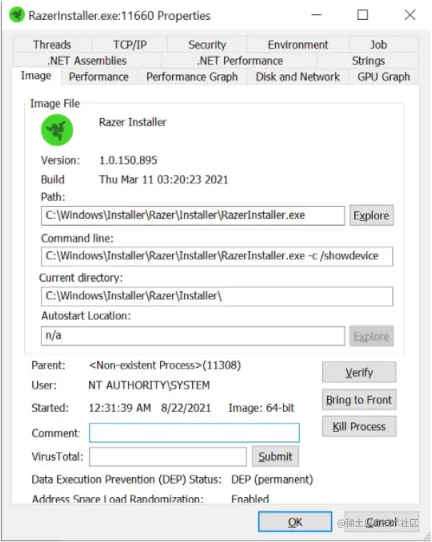 由于RazerInstaller.exe可执行文件是由具有SYSTEM权限的Windows进程来启动的,因此Razer安装程序也就获得了SYSTEM权限,如下图所示: