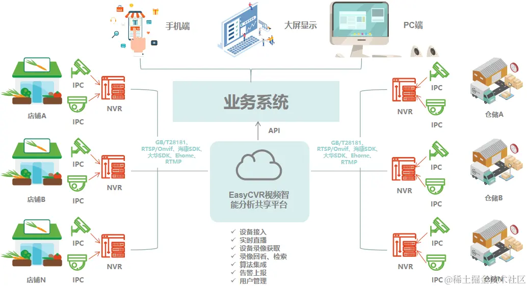 根据此需求,我们可以通过EasyCVR智能共享平台,将各生态的监控设备统一接入,分业态进行设备管理及用户权限管理,同时支持通过GB28181进行告警上报处理,支持设备录像回看(在海量设备接入的项目中,建议将分析与存储放置于边缘侧,有效节省流量、带宽及存储资源),支持通过API接口与已有业务系统对接(支持单点登录定制开发),实现全终端、不同权限管理人员随时随地监管。