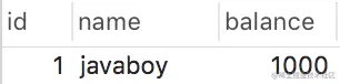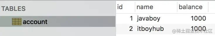 表的数据很简单,有 javaboy 和 itboyhub 两个用户,两个人的账户各有 1000 人民币。现在模拟这两个用户之间的一个转账操作。