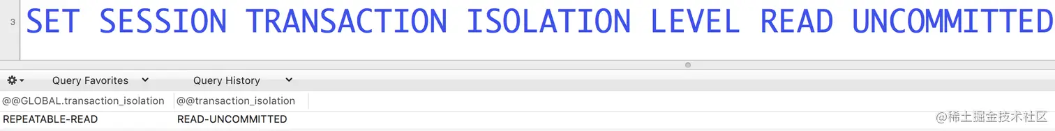 上面这条 SQL 表示将当前 session 的数据库隔离级别设置为 READ UNCOMMITTED,设置成功后,再次查询隔离级别,发现当前 session 的隔离级别已经变了,如图1-2: