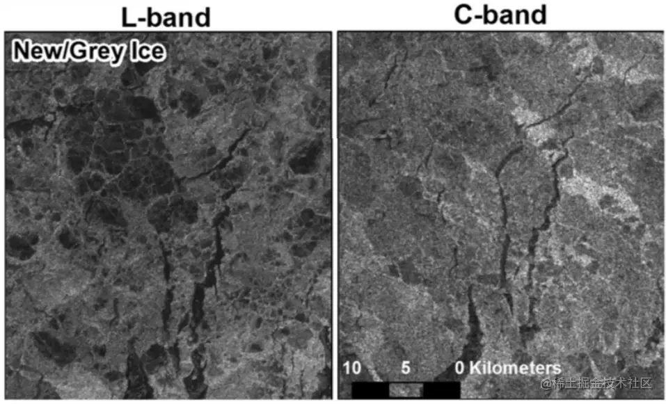 2018年Howell海冰监测对比,左图为L波段结果,右图为C波段结果,可以看出L波段视野下,海冰纹理信息更加丰富。