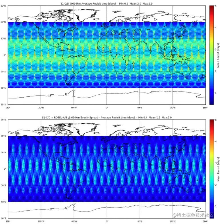 模拟的ROSE-L(假设有两颗星)和Sentinel-1A/B访问覆盖情况,上图为只有Sentinel-1A/B观测,下图为ROSE-L和Sentinel-1A/B组合观测,该图由欧空局 Michel Tossaint制作。可以看出,两种卫星联合后,地球上大部分覆盖区域能够实现1-2天的重返覆盖。