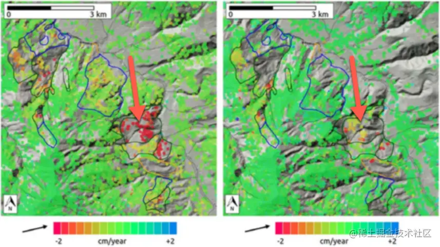 秘鲁Cordillera Blanca区域的2015-2017年LOS向平均形变速率,左图为ALOS-1(L波段)的结果,右图为Sentinel-1(C波段)的结果,可以看出L波段相比于C波段,对于快速形变点(箭头所指红点)能够实现更好的制图。