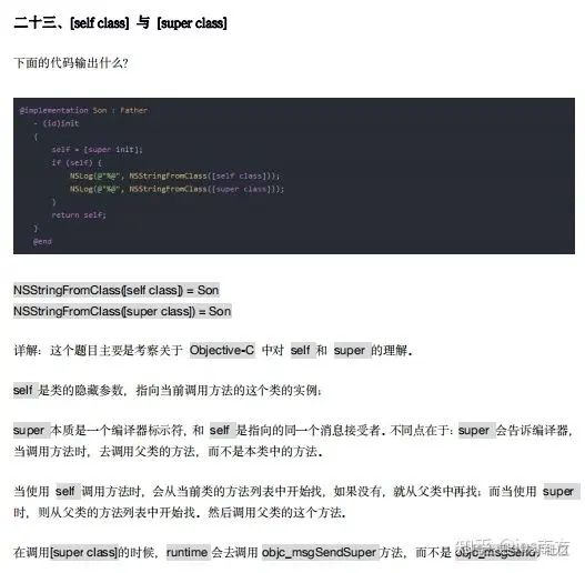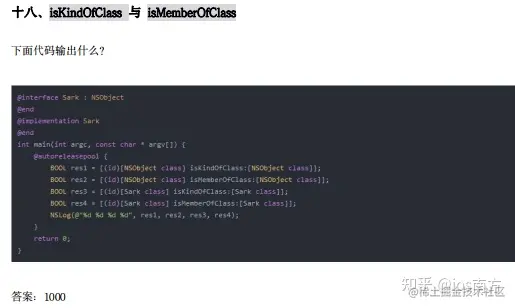 同理,[Sark class]执行完之后调用 isKindOfClass,第一次 for 循环,Sark 的 Meta Class 与[Sark class] 不等,第二次 for 循环,Sark Meta Class 的 super class 指向的是 NSObject Meta Class, 和 Sark Class不相等。第三次 for 循环,NSObject Meta Class 的 super class 指向的是 NSObject Class,和 Sark Class 不相等。第四次循环,NSObject Class 的 super class 指向 nil, 和 Sark Class 不相等。第四次循环之 后,退出循环,所以第三行的 res3 输出为 NO。