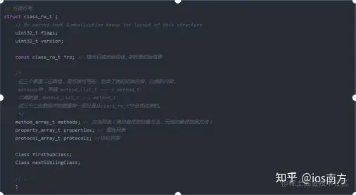 rw代表可读可写。ObjC类中的属性、方法还有遵循的协议等信息都保存在class_rw_t中: