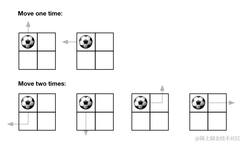 输入: m = 2, n = 2, maxMove = 2, startRow = 0, startColumn = 0