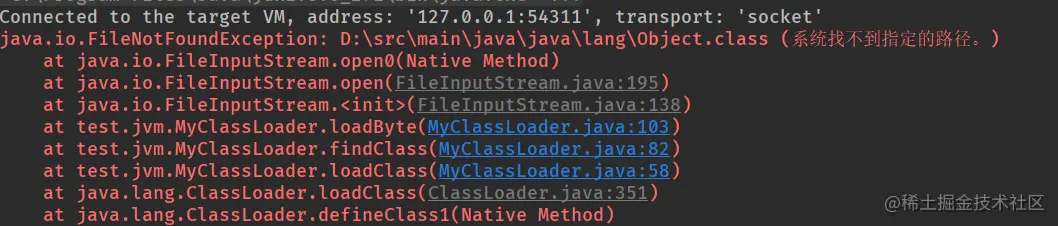 居然是找不到 Object 类,这个就跟上一篇文章有关联了,加载一个类,会触发父类的 init 方法,从而触发父类的加载,也就是说,我这里打破了双亲委派,所以 JVM都使用了我们自定义的类加载器来加载类。