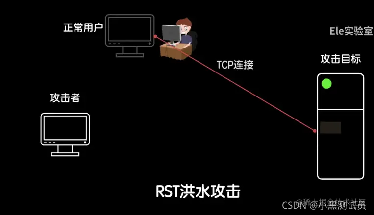 RST洪水攻击就是利用了TCP的RST机制,例如攻击者知道用户地址以及用户会和目标服务器之间进行TCP连接,此时攻击者可以通过伪造TCP正常用户的RST请求发送给服务器,让服务器误以为正常用户的RST请求而导致异常关闭连接。如果攻击者不知道用户的ip地址则可以通过发送大量伪造的RST请求给目标服务器进行盲打,只要刚好IP地址个某个用户对上就会导致用户和服务器之间的连接异常关闭。