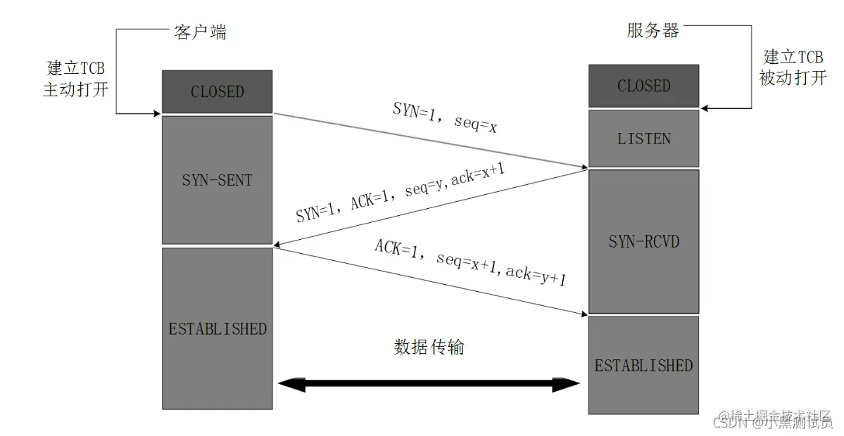 TCP协议的可靠性是通过三次握手过程来实现的,过程如下:
