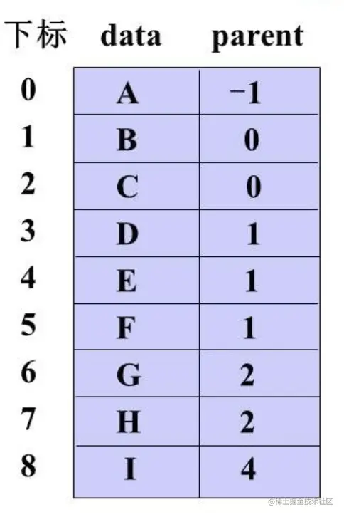- parent:存储该结点的双亲在数组中的下标