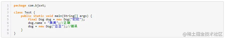 特别注意:final修饰基本类型变量,其值不能改变,由原来的变量变为常量;但是final修饰引用类型变量,栈内存中的引用不能改变,但是所指向的堆内存中的对象的属性值仍旧可以改变。例如