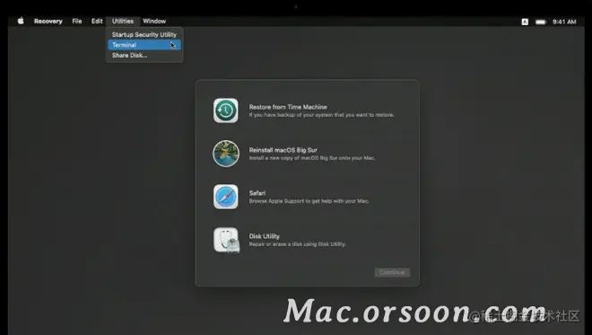 1.启动 Mac 并继续按住电源按钮,直至您看到启动选项窗口。选择“选项”,然后点按“继续”。