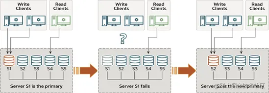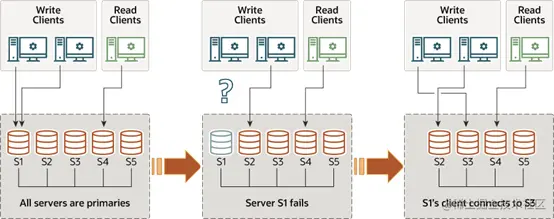 高灵活性,有单主模式(图1)和多主模式(图2),单主模式下,会自动选主,所有更新操作都在主上进行;多主模式下,所有server都可以同时处理更新操作。
