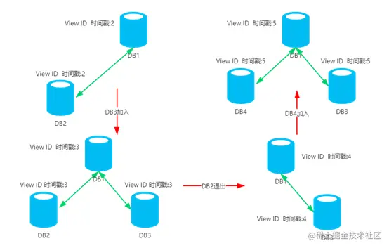 组复制以组视图(Group View,后续简称视图)为基础来进行成员管理,视图一般在Group在一段时间内的成员状态,如果这段时间没有成员变化,也就是说没有成员的加入和退出,一旦有成员加入或者退出组,则视图就发生变化,并且使用视图ID(view id)进行跟踪变化区分先后时间,下面我们来看一张图演示一下: