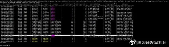 select threadid,processid,usename,attribute,status,enqueue,statement_mem,active_points,control_group,resource_pool,substring(query,position('explain'in query),20) as subquery from pg_session_wlmstat order bystatus,attribute,usename,subquery,resource_pool;