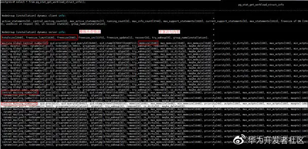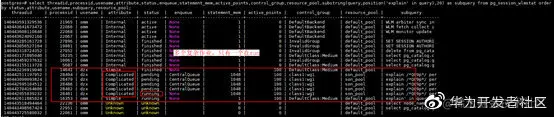 2)如果是有workload视图中有running状态的语句,但是实际上pgxc_stat_activity或者pg_session_wlmstat视图中只有waiting状态的语句,并且workload视图中,存在两条或者多条语句的qid.queryId的值相同。那么基本确定走问题处理场景二。