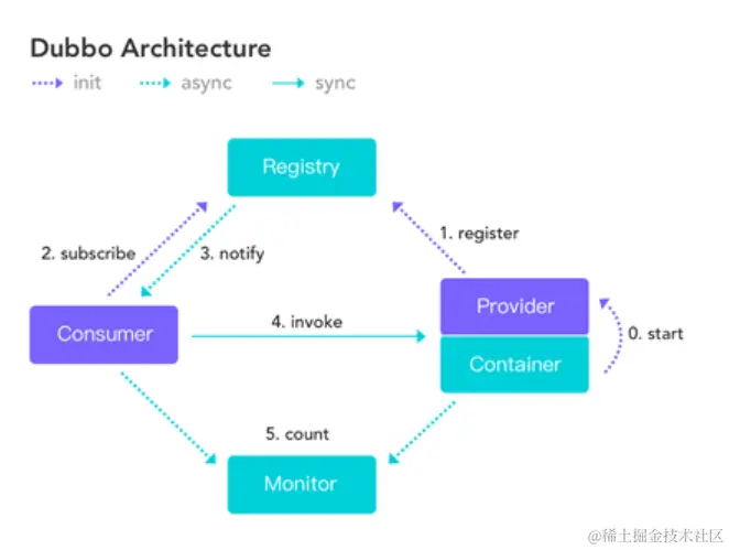 - 注册中心(Registry):注册中心返回服务提供者地址列表给消费者,如果有变更,注册中心将基于长连接推送变更数据给消费者