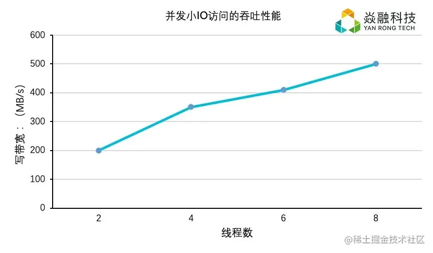 例如,我们使用一个应用程序执行10KB写IO,结果下图所示。使用一个IO线程,它可以达到115MB / s。两个线程基本上使吞吐量加倍;和4个线程再次加倍。使用8个线程可达到约500MB / s。