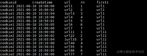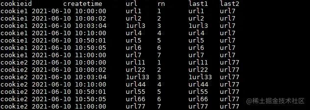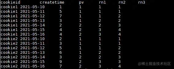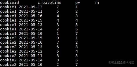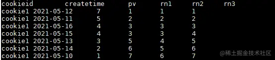 ROW_NUMBER() OVER(PARTITION BY cookieid ORDER BY createtime) AS rn,