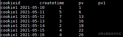 sum(pv) over(partition by cookieid order by createtime) as pv1