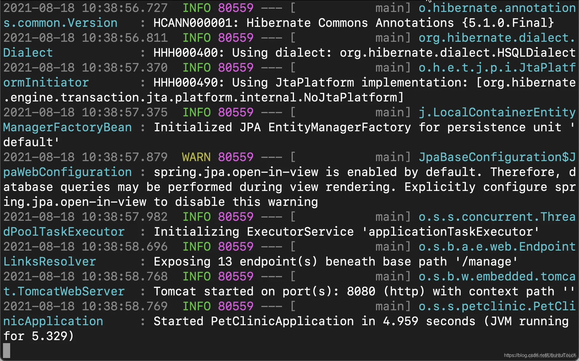 2021-08-18 13:28:47.281 INFO 84135 --- [main] o.s.s.concurrent.ThreadPoolTaskExecutor : Initializing ExecutorService 'applicationTaskExecutor'