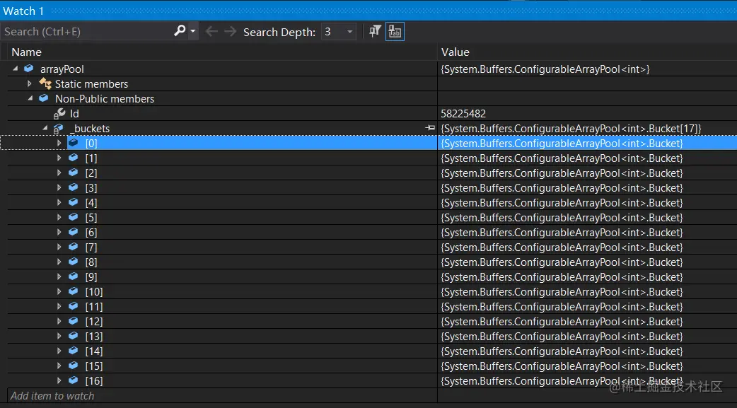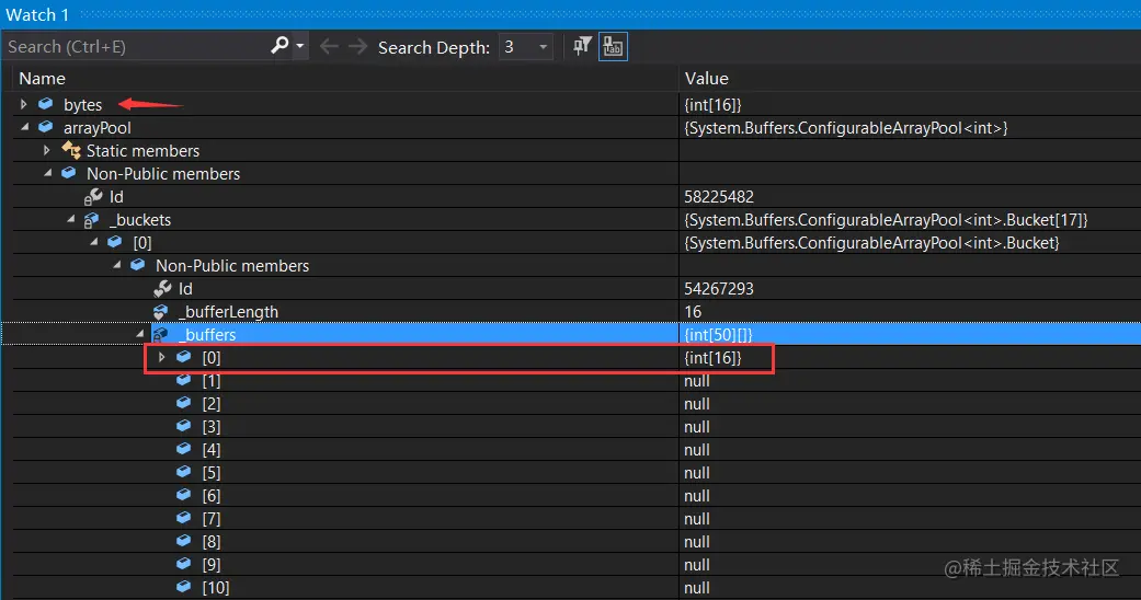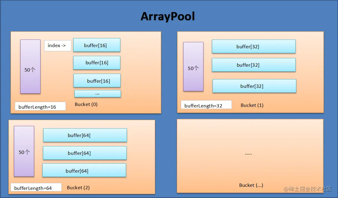 ArrayPool 是由若干个 Bucket 组成, 而 Bucket 又由若干个 buffer[] 数组组成, 有了这个概念之后,再配一下代码。