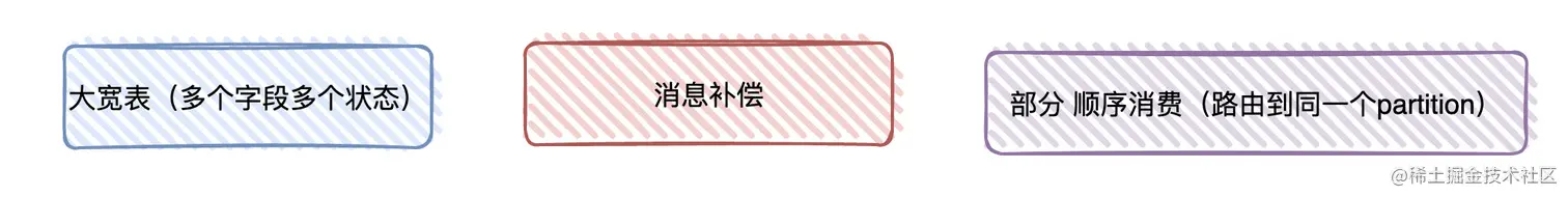 候选者:一、宽表:将每一个订单状态,单独分出一个或多个独立的字段。消息来时只更新对应的字段就好,消息只会存在短暂的状态不一致问题,但是状态最终是一致的