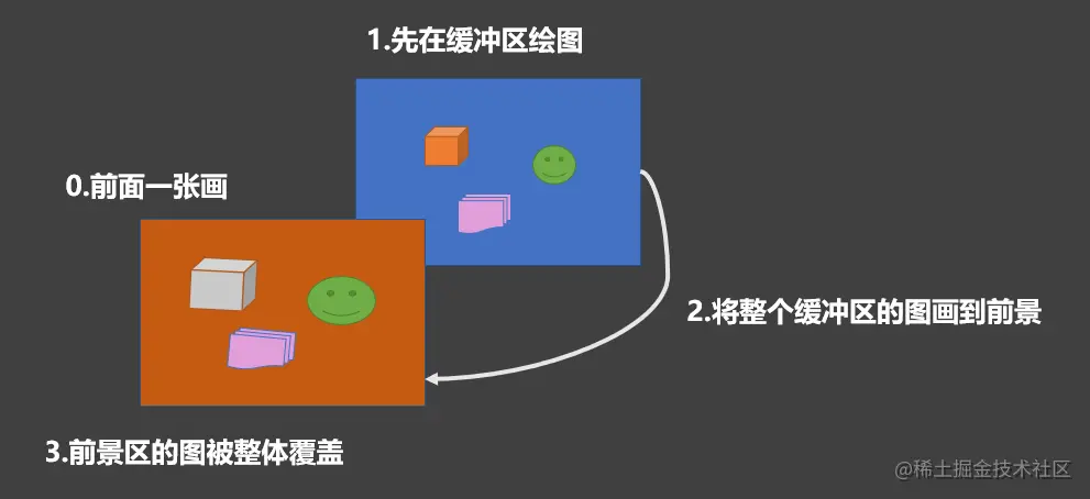 双缓存画布技术的核心在于系统需要在内存中开辟一块与当前画面等大的“逻辑屏幕“。我们的画图和动画操作都会先作用于这块”逻辑屏幕“中,当一个操作在这块”逻辑屏幕“上完成之后,再把整块”逻辑屏幕“投放到我们的屏幕上。