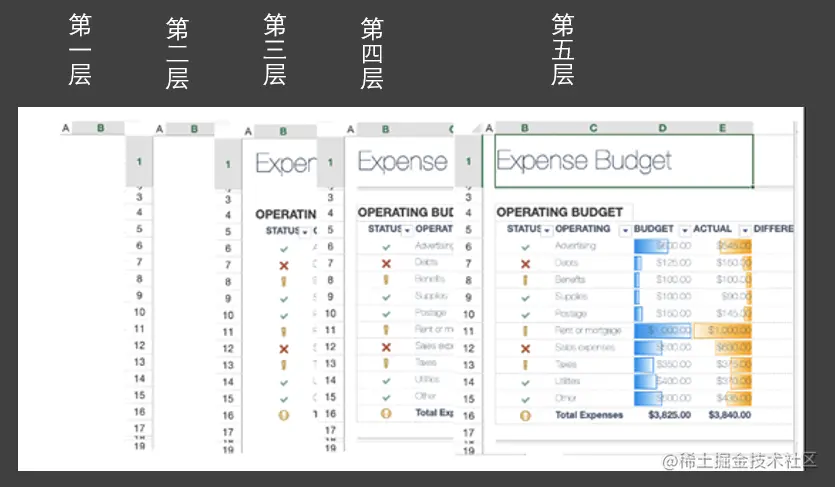 上图是纯前端电子表格中50000*20=100000个数据,处理只需要0.038s。在该纯前端电子表格中,整个绘制引擎根据油画绘制原理,分为主体图层和装饰图层,主题图层将会渲染持久的,不会轻易改变的元素,例如背景,单元格,表格线等。而装饰图层则会渲染常变性元素,例如选择框,拖拽框,悬浮效果等。在下图中第一层到第四层都是主体图层的内容,第五层是装饰图层。