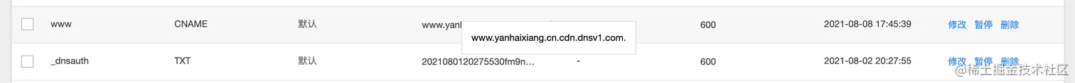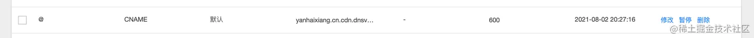 另外一个常见的场景就是 CDN 服务器,如果在腾讯云上买了一个 CDN 服务器,它也会提供一个 “不那么乱码” 域名,比如我的个人网站就是 www.yanhaixiang.cn.cdn.dnsv1.com。同理,在 DNS 添加一条 CNAME 记录指向 CDN 提供的域名就能访问 CDN 上的资源了。