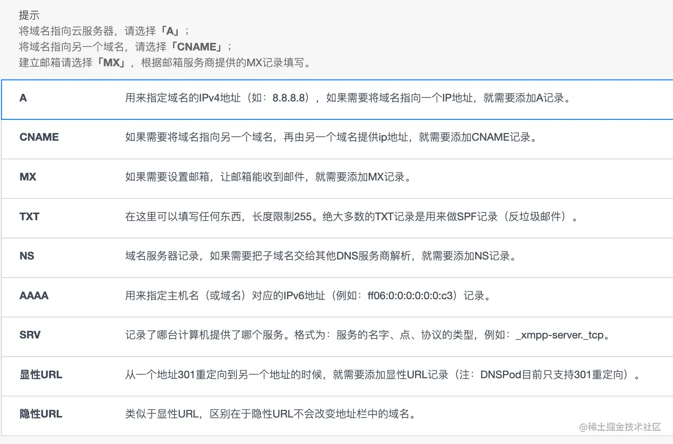 当然,DNS 解析服务并不单单只有 域名 -> IP 地址 一个功能,还能解析邮件服务器、CNAME 配置等。下面我就直接结合 腾讯云 的 DNS Pod 的解析规则来说明吧。