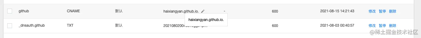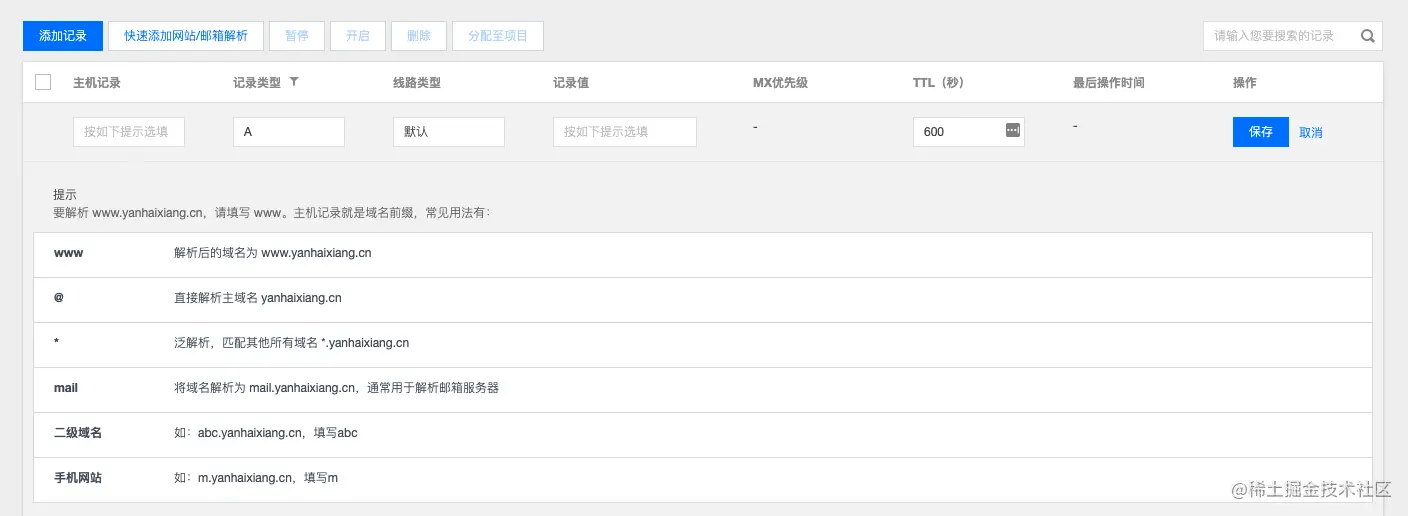 子级的好处就在于可以不用上线一个网站就买一个对应域名,太费钱了~ 比如我之前买了 yanhaixiang.cn 这个域名,当要用这一个域名分别指向 国内腾讯云上的个人网站,以及 Github 提供的 Github Pages,在添加两条记录之后: