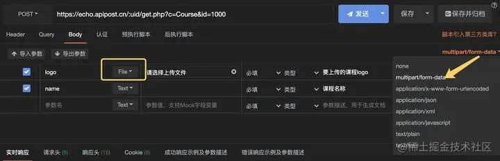 2)当你需要提交有文件的表单时,切换到 form-data\