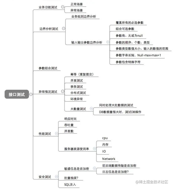 接口测试的用例设计是关键,不能只是单纯正常请求通过就算接口测试过了,要从业务、功能、性能等上去设计用例。参考了网上的资料还有平时自己的一些经验,下图算是一个大致的设计思路吧