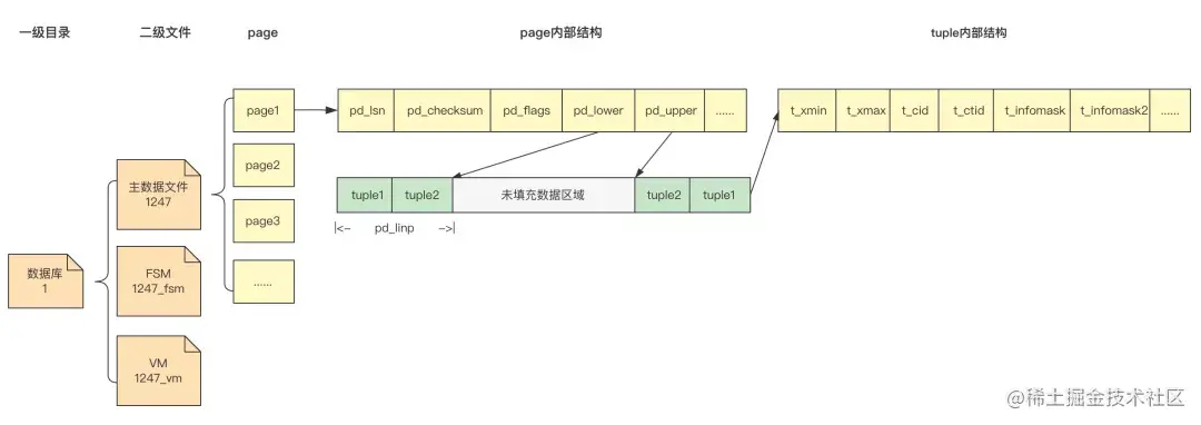 当关系文件大小低于RELSEG_SIZE × BLCKSZ时,数据库引擎创建名称为pg_class.relfilenode的单文件,反之会切分为名称如pg_class.relfilenode.segno的多个文件。单个关系文件内部被划分为默认8K固定大小的多个page并存储在磁盘上,8K可以在initdb时通过BLCKSZ参数修改配置。主数据文件写入时,会先将元组数据从行指针数组的底部开始堆叠,直到空间耗尽。