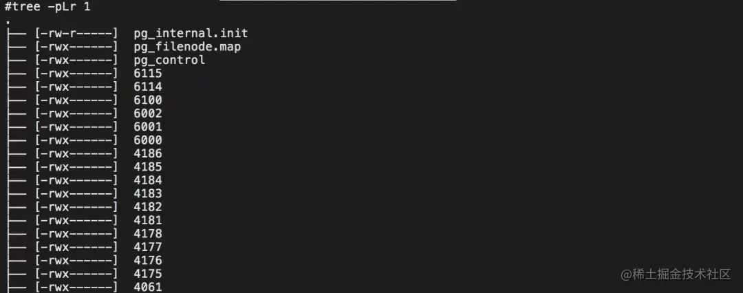 目录结构分为两级,第一级结构如下图所示,一级目录名是用户数据库对象的OID,1代表的是postgres数据库,一级目录内的二级子文件都是隶属于该数据库对象的关系,包括表、索引、视图等。