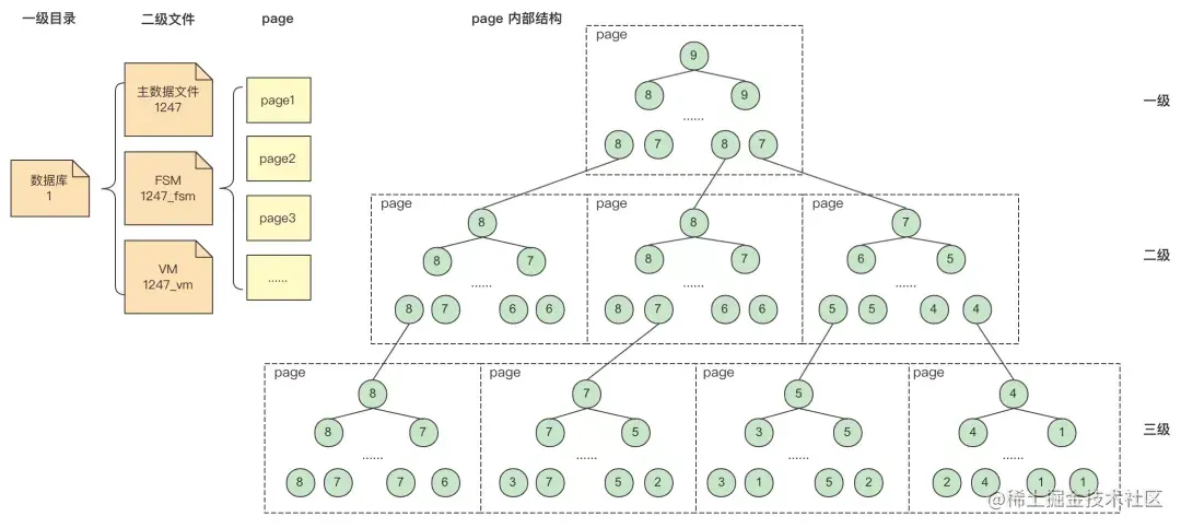 总体上,FSM采用3-4级多叉树的结构组织FSM page,单个FSM page内部采用完全二叉树的结构进行管理,高级别FSM page的叶子节点关联低级别的FSM page,低级别FSM Page的叶子节点存储着heap、index page的可用空间数目,而非叶子结点依次存储叶子节点的最大可用空间数目,每个节点占用1个字节。