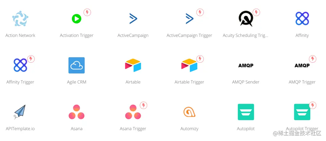 n8n 的工作原理也非常简单,上图中这些应用都会开放一些 API ,通过应用程序的 API 连接到应用程序就是 n8n 开源工具的职责。
