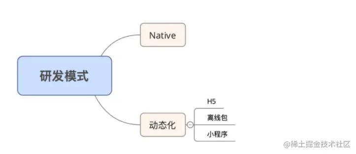目前研发模式分为Native模式和动态化模式两种,其中Native技术栈主要覆盖基础中间件,还有核心高保链路或者变更很少的一些基础页面,比如收银台,登录页面,付款码等。其他场景业务一般会通过动态化的方式,解耦客户端版本发布。其中,在线H5一般适用于活动营销活动,离线包场景一般用于有固定入口的常驻业务,如果有跨端多投场景,一般会选择小程序,通过小程序的跨端发布实现多端投放。