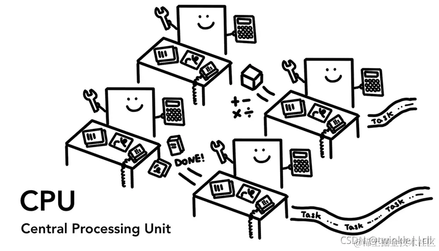 图1: 4CPU内核, 就像办公司工作人员坐在每一张桌子钱处理到来的任务.