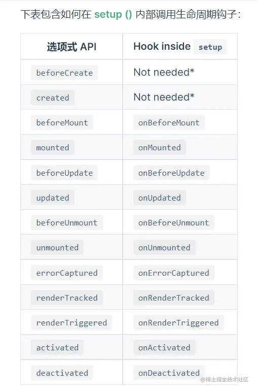 正如官方文档所说,setup()取代之前的beforeCreate()和created生命周期函数,其余生命周期函数放在setup()实现。