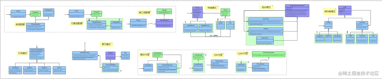 - 适配器模式, 桥接模式, 装饰模式, 组合模式, 外观模式, 享元模式, 代理模式