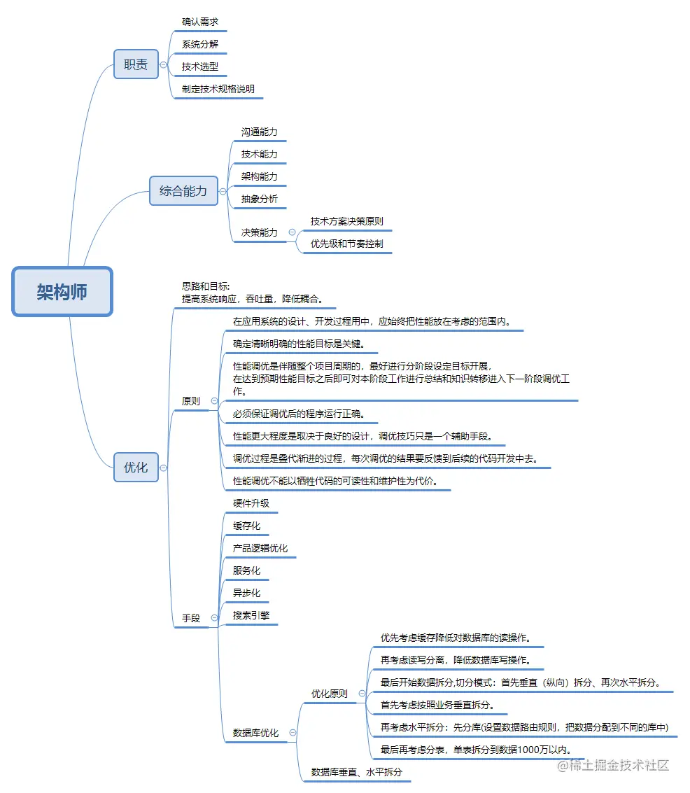 本文将从多个方面讲述如何成为一名优秀的架构师,以及一个架构师应该具备什么样的技术要求和职业素养。我在这里整理了个脑图,方便系统性的查阅。