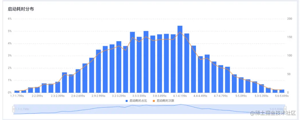 启动趋势较为直观的展示应用启动耗时的平均值、分位值、区间分布等数据,以及启动阶段的性能分解数据,也能分析出,多版本迭代后,启动时间的分布状况。