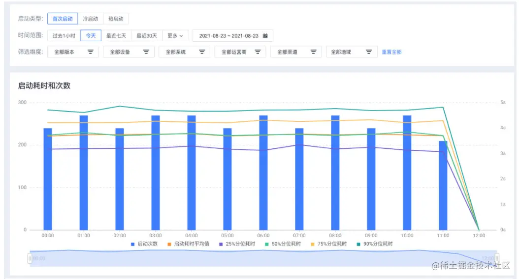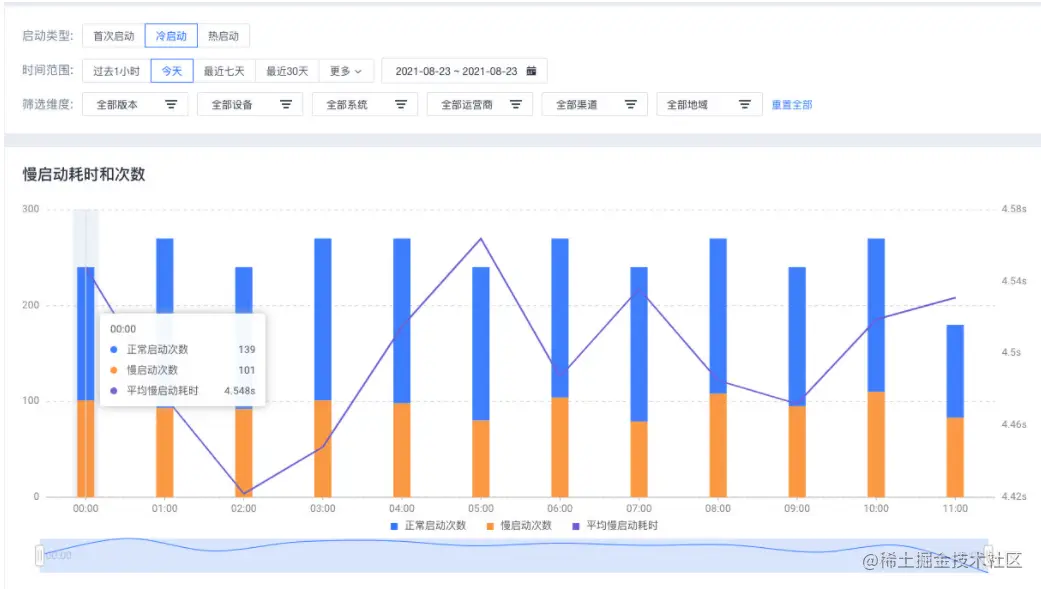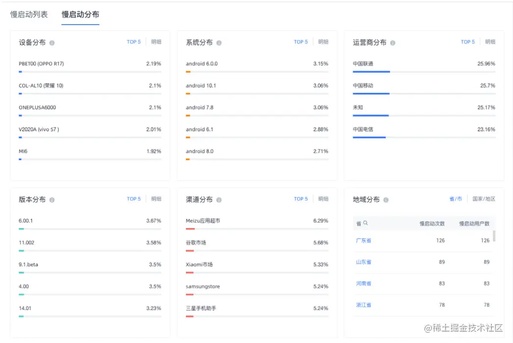 慢启动分布,直观表现出,慢启动分布的设备、系统、运营商、版本、渠道、地域。