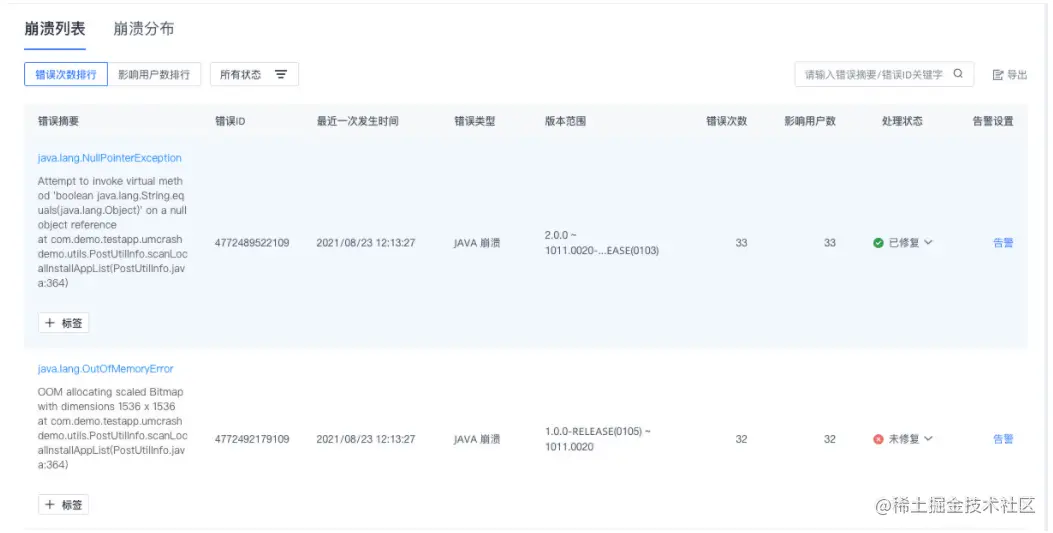 归纳启动阶段中出现的崩溃信息,支持划分首次启动、冷启动、热启动状态下的崩溃,默认启动耗时上限为8秒,超出时间的崩溃不被划分至启动崩溃。