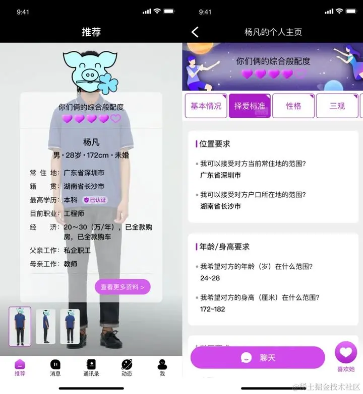 铢铢团队研发的大数据推荐算法,结合国情和当代的婚恋观,综合双方各项条件和择爱要求,精准、有效地匹配三观一致,性格相配的人生伴侣。
