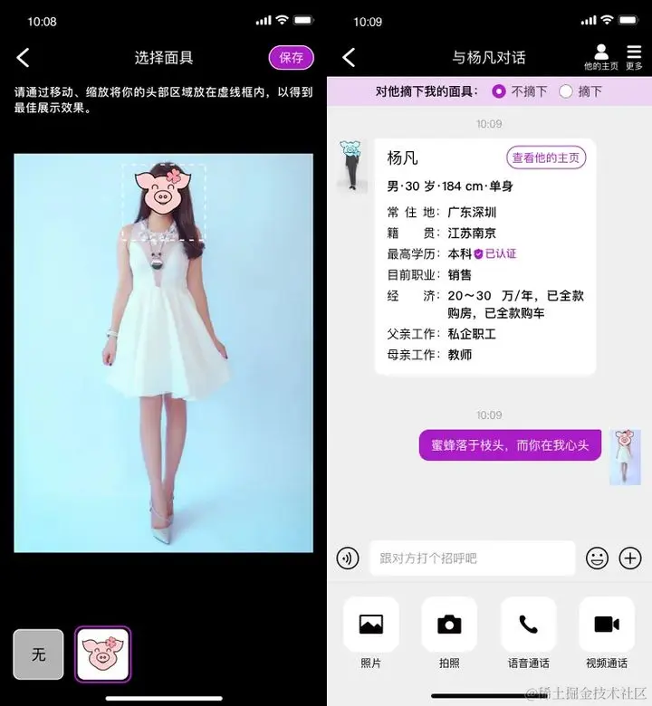 在私域:一对一聊天,界面的顶部有两个比较人性化的按钮,用户可以在合适的时候手动对你心仪的人摘下你的面具。